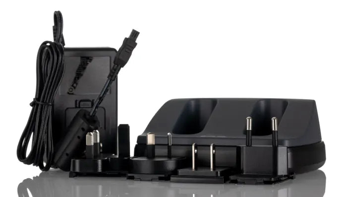 El FLIR T198125 es un cargador de batería independiente de 2 bahías, que incluye una fuente de alimentación con enchufes multiestándar para cargar cámaras térmicas de las series Kxx.