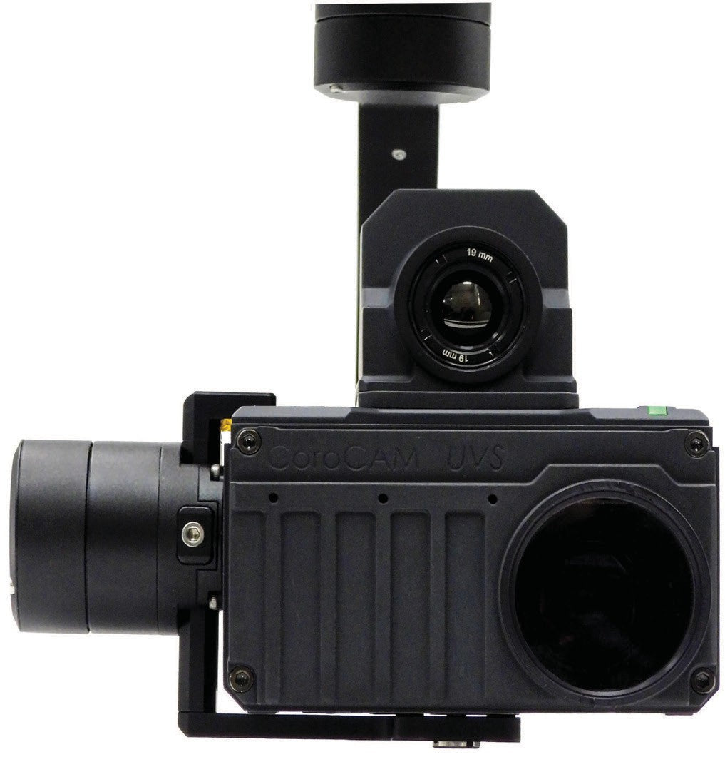 CoroCAM ® UVS es una combinación diseñada para UAV del exitoso sensor de corona CoroCAM Solar Blind y una cámara visible HD en un paquete liviano capaz de adaptarse a cardanes más pequeños.